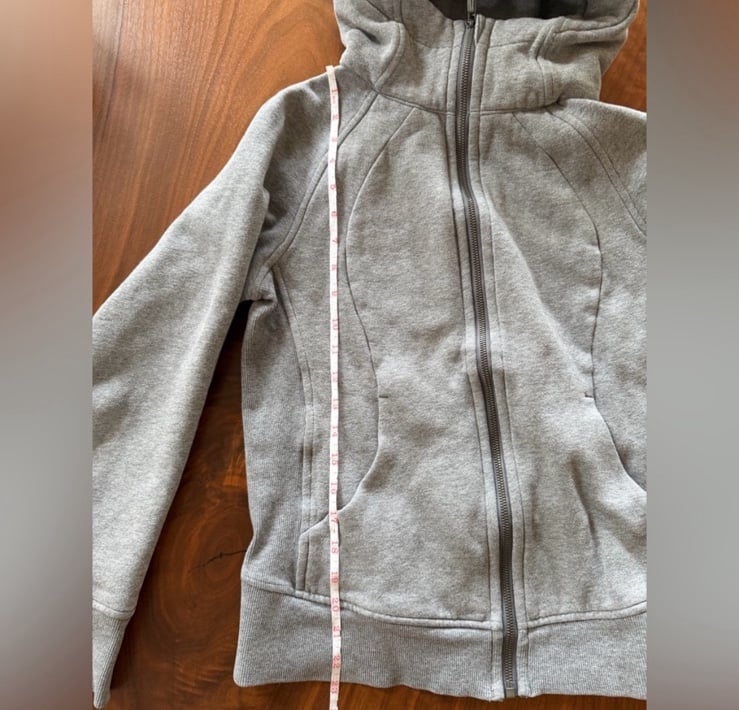 Scuba hoodie, gray, size 6 (the size tag was removed but there is a lululemon size 6 round mark inside the pocket) zipper, pockets, no flaws.